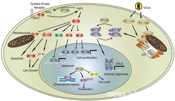 新闻网讯(通讯员陈述亮)郭德银教授研究组日前发现,人类重要抑癌蛋白PTEN不仅具有抗肿瘤功能,还在抗病毒先天免疫中发挥关键作用,相关成果于12月21日在Nature(《自然》)子刊Nature Immunology(《自然免疫学》)...