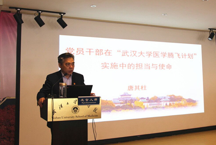 (通讯员童欧慧)按照学校党委“不忘初心、牢记使命”主题教育部署安排,10月30日下午,校党委常委、副校长唐其柱到快猫短视频 讲授专题党课。快猫短视频 党工委副书记蒋明主持报告会。 唐其柱以《党员干部在“快猫短视频 医学腾飞...