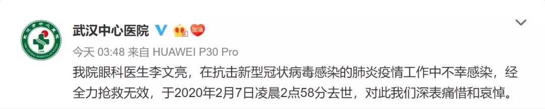 2020年02月07日来源:武汉市人民政府 武汉中心医院李文亮医生,因感染新型肺炎,经全力抢救无效不幸去世。我们深表哀悼,万分惋惜!对其坚守一线抗击疫情表示敬意,对其家人表示诚挚慰问! 武汉市人民政府 2020年...